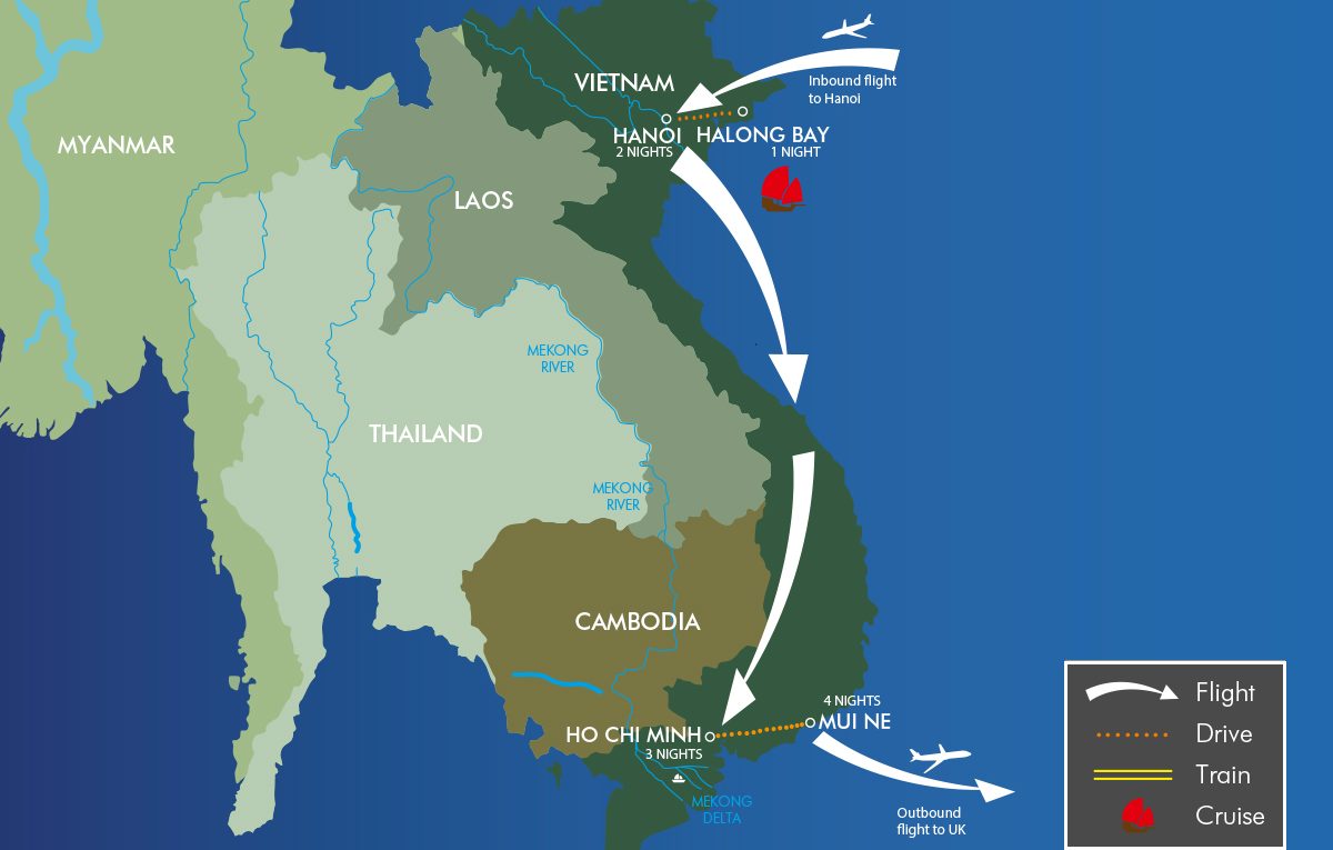 This compact tour of Vietnam offers a glimpse into the country’s main highlights, packaged together with a few days relaxation beside the beach at the end of the trip. In Hanoi see the curious One Pillar Pagoda and the Temple of Literature. Continue to Halong Bay for a memorable cruise among the beautiful limestone peaks before flying to the bustling Ho Chi Minh City. Here you can see the fascinating Cu Chi tunnels and venture into the lush Mekong Delta to see how the locals live and work. End your tour with some time on the beach at Mui Ne.