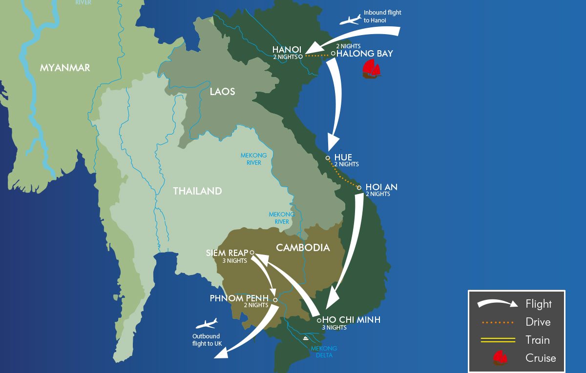This tour is inspired by the many sights, sounds and flavours of these wonderful countries. Visit the sparkling turquoise waters of Halong Bay – a UNESCO World Heritage site. In the northern capital Hanoi visit the lively Old Quarter and the impressive Presidential Palace. Discover Hue, once Vietnam’s Imperial capital, and the delightful ancient town of Hoi An. Explore the colonial architecture of Ho Chi Minh City, and the fascinating markets and daily life on the Mekong Delta. Cross the border into Cambodia for the world famous Angkor Temples in Siem Reap and the old world charms of capital city Phnom Penh.