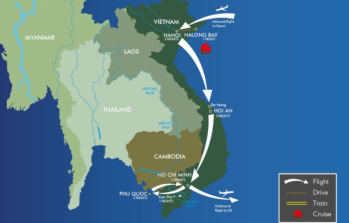 Discover Vietnam’s finest highlights at a relaxed pace with stays in the captivating capital city of Hanoi, the charming UNESCO town of Hoi An, and the bustling and enigmatic Ho Chi Minh City. You will enjoy two overnight cruises in beautiful Halong Bay and the beguiling Mekong Delta region. Finish your tour on the stunning Phu Quoc Island with its exquisite powder white sand beaches. This itinerary is perfect for honeymooners and those celebrating a special event, wanting quality time and relaxation.