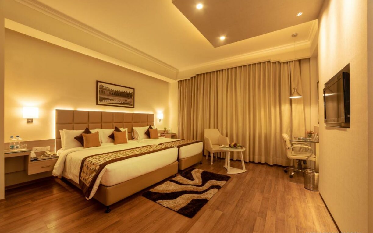 Clarks Shiraz in Agra features luxuriously appointed rooms, each equipped with modern amenities, including a flat-screen TV, an expansive work desk, a well-furnished wardrobe, premium toiletries, and complimentary Wi-Fi. Delight your palate with a diverse range of culinary delights in our world-class restaurants and unwind in the evening at our rooftop bar with breathtaking views of the Taj Mahal.