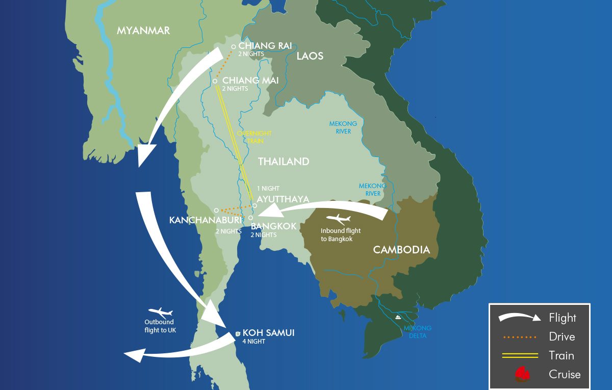 An ever popular destination, Thailand has so much to offer the visitor, from historic palaces and temples, ancient ruins, tropical islands with white sand beaches, jungle, Hill Tribe villages, interesting culture, stunning scenery and delicious cuisine. See some of the highlights of this fascinating country on this sample itinerary. Start in the vibrant and bustling capital city of Bangkok before continuing to Kanchanaburi and seeing the famous Bridge over the River Kwai. Admire the beauty of the Erawan Waterfalls and see the Hellfire Pass before arriving at Chiang Mai and Chiang Rai, visiting the local Karen Hill Tribe people and taking a boat ride at the Golden Triangle. Your tour ends with some time to relax on the white sand beaches of Koh Samui.