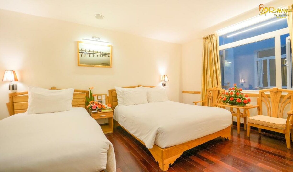 Romance Hotel, nestled in the heart of Hue, offers a serene retreat for travelers seeking both comfort and cultural immersion. Our 4-star hotel features well-appointed rooms equipped with modern amenities, including a flat-screen TV, desk, spacious wardrobe, toiletries, and a kettle. Indulge in a delightful buffet breakfast served daily in our restaurant, and unwind in the evening at our inviting bar.